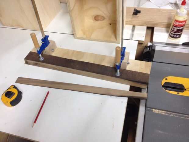 Ajuste la barra de grapas a la madera; luego ajuste la guía de tu Hanon para quitar la cantidad mínima necesaria para incluso hacia afuera del borde no cuadrados.