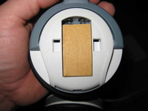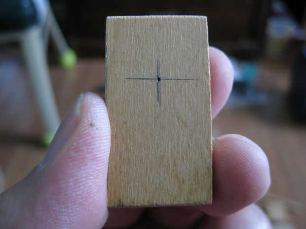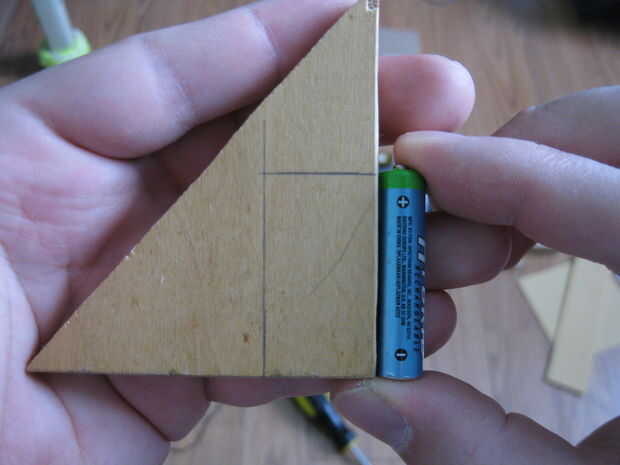 Agarrar un pedazo de su trozo de madera gruesa de 3/8" y con su regla crear un rectángulo de las dimensiones de 1 & 9/16" longitud y 14/16 o 7/8" ancho. Si tienes una pieza con un ángulo recto entonces usted puede utilizar como uno de sus bordes exteriores. Cortar la pieza y lije los bordes hasta que estén suaves e incluso. Prueba de colocarlo en el compartimento de las pilas de los auriculares. Si su pieza es un poco demasiado grande o está apretada, lije los bordes otra vez hasta que se encaje sin obstrucciones. Coloque la pieza terminada al lado por el momento.