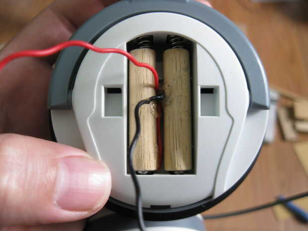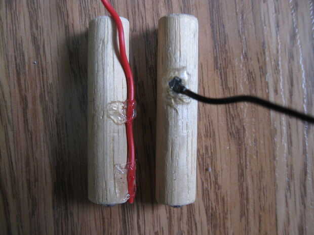Conecte la pistola de pegamento caliente porque para terminar el puente entre las dos baterías maniquí necesitamos guía, a continuación, pegar los cables en los lugares apropiados. La barra de negativa debe ser pegado donde el cable sale de la cavidad interior. La varilla positiva debe pegar abajo a lo largo de su lado hasta que llegue a la zona donde sobresale el cable negativo de la barra negativa.