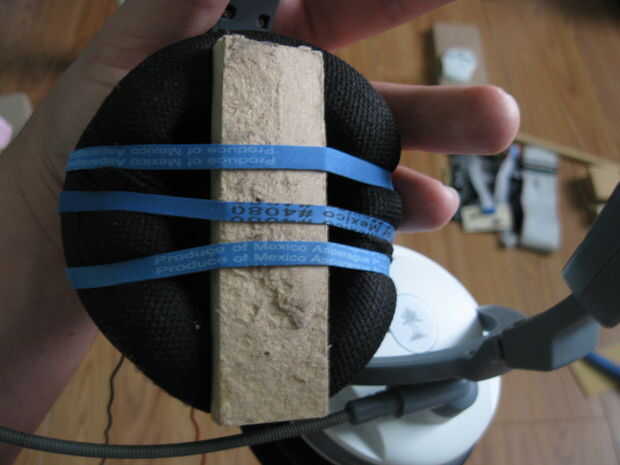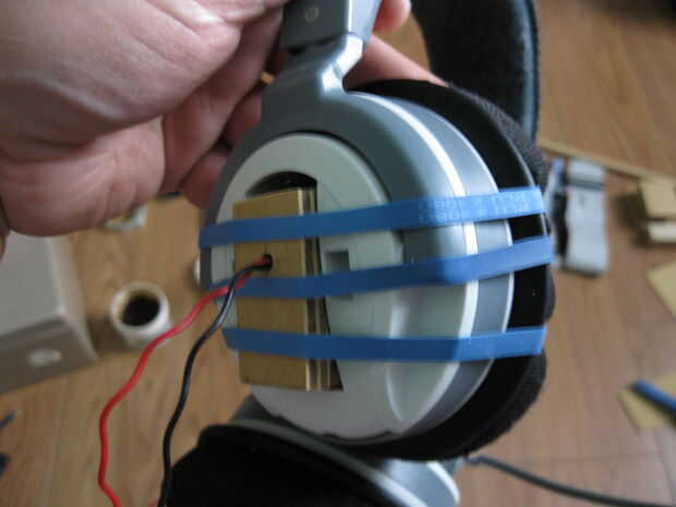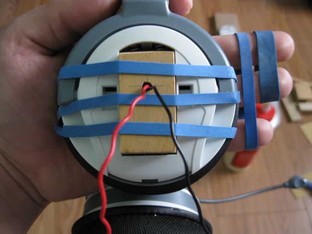 Utilizar sus madera palitos de pegamento y algodón para aplicar una pequeña cantidad a las barras (ver fotos). También puede aplicar una pequeña cantidad en la parte posterior de la articulación. No aplique demasiado como puede exudar hacia abajo en el auricular. Deslice los cables a través de la articulación y presiónelo firmemente contra el auricular. Tire los cables un poco para asegurarse de que están a través de todo el camino. Ahora usar sus bandas de caucho para crear una fuerza de sujeción entre las varillas y el empalme (ver notas *). Sugeriría colocar otro elemento en el interior del auricular para agregar más tensión, basta con un trozo de madera. Deja las gomas en hasta que la ha pasado el tiempo asignado de la vinculación. Esto puede variar entre marcas. (ver nota *)