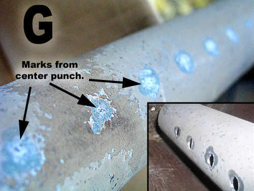 Use un punzón para marcar los lugares para perforar, en caso contrario la broca va a ser difícil iniciar. El punzón también romperá cualquier capas de vidrio. Se necesita mucha presión para obtener a través de ambos lados del tubo. Encontré que tenía que afilar la broca cada 2 o 3 agujeros. Foto G muestra esto.