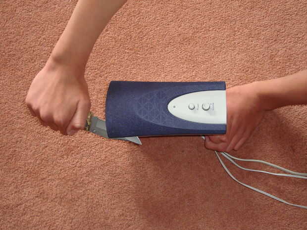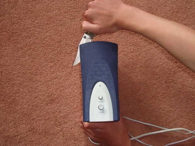 Con un cuchillo lardge Deslice el cuchillo entre el plástico y la tela. Trabajo gentley su camino alrededor de la caja (olny principal) speeker haciendo presión de la placa frontal, tenga cuidado de no para apuñalar el altavoz.
