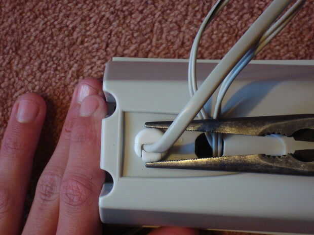 Un transfourmer de la carcasa luego utilizando un par de plyers apriete la pinza que sostiene el cable en y luego jale hacia afuera. Cortar el enchufe y tire del cable a través de. Puede deshacerse de la transfourmer, guárdela para usarla en otras cosas o convertir el recomendable volver más tarde.