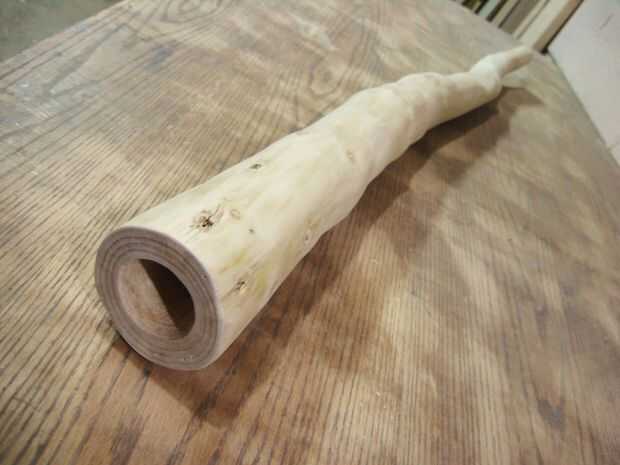 Dio el didge todo lijado final unos con granos progresivamente mayores y entonces le dio tres capas finas de spray laca y una lijado para acabar con la luz.