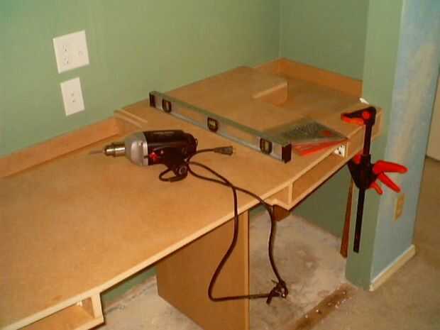 Después de que el cierre ha sido pintado y se ha instalado el cableado eléctrico ahora es el momento para volver a instalar el escritorio. Esta vez pegue y atornille todas las juntas por última vez. Asegúrese de que todas las superficies estén nivelados. Tenga cuidado de no dañar la pintura en las paredes cuando vuelva a instalar las piezas de escritorio.