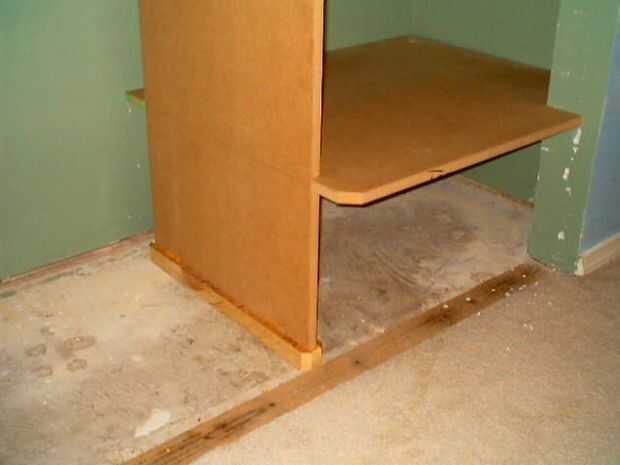 Corte de pies para la parte inferior de las piernas y corte estantes. Fije los estantes a la pared de la misma manera que la mesa fue unida a las paredes. Fije los estantes a pata en un dato del surco cortado en el lado de la pierna. Deslice los pies debajo de las patas de la parte delantera. Los pies tienen un dato surco cortado en su parte superior. Puede que necesite utilizar un mazo de goma para instalar los pies... el ajuste debe ser ceñido.