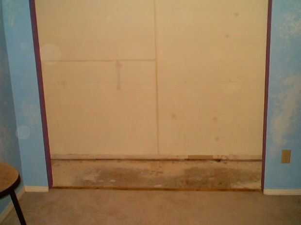 Inicio con un armario vacío. Retire las puertas del armario, alfombras y recorte. Este armario es de aproximadamente 2 pies de profundidad por 8 pies de ancho. Más fácil trabajar con un agradable espacio de trabajo limpio.