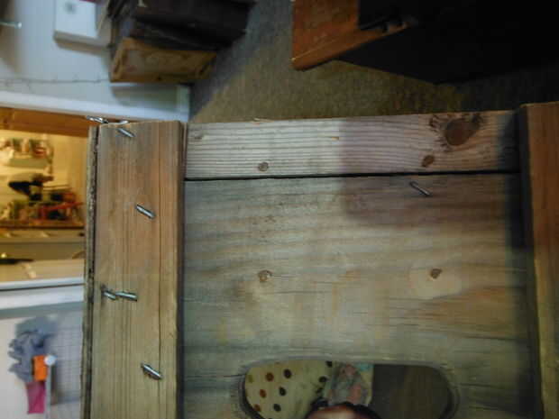 Luego, coge el taladro y hacer los agujeros. Desde que fui reutilización de uñas y también clavar madera extremadamente delgada, viejo, taladré orificios pequeños en los lados de las juntas para mis uñas. Otro buen truco para evitar rajaduras madera cuando usted está conduciendo un clavo en él es tomar el clavo, pusieron la cabeza en el suelo y dar la punta unos golpes ligeros con el martillo antes de conducirlo.
