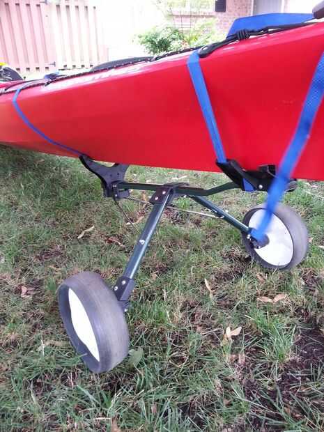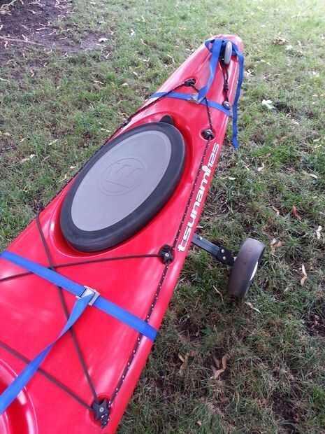 Ahora coloque el carro en su kayak (o piragüismo) y jugar con opresión en el posicionamiento y la correa. Encontré la primera vez que lo probé, la cosa entera se deslizó fuera de la parte trasera del kayak. Usted puede tener que tejer las correas a través de los cables en la parte superior del kayak para evitar que el carro se deslice hacia atrás.