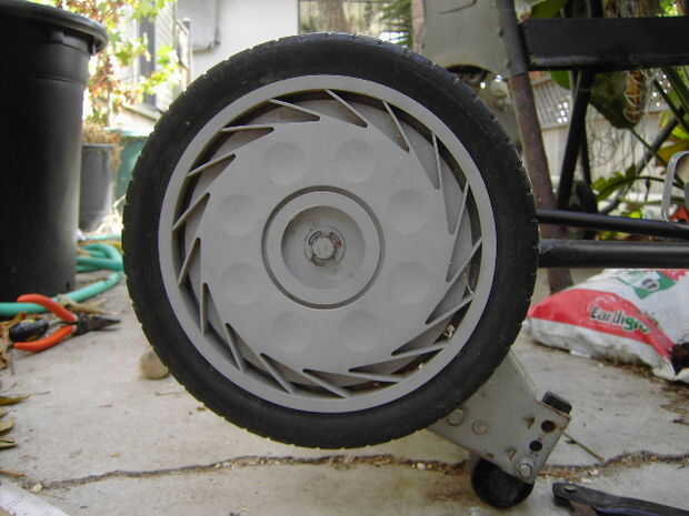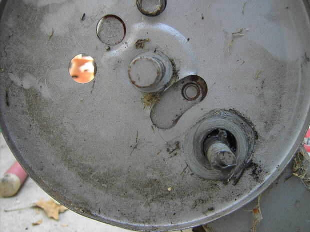 Utilizar una amoladora o sierra para metales para cortar el eje de la cortadora de 1/8" a 1/4" más largo que la ubicación de la ranura y cortar el motor hasta que esté casi paralelo con el lado de la segadora al tocar el eje. En mi caso aproximadamente 1" del lado de la segadora por lo tanto el espaciador de goma.