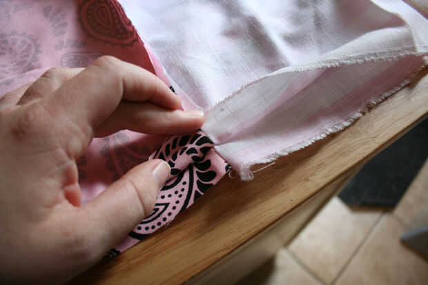 Una vez que han sido cosidos los lados, coser directamente a través de la parte inferior de la parte exterior de la bolsa, luego coser en la parte inferior del forro, pero deja una 4" de apertura para el torneado.
