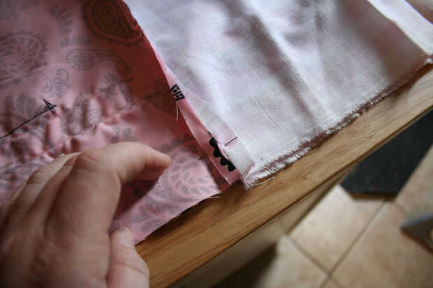 Ponen la bolsa paneles derecho lados juntos. Línea de la costura del forro y el frente y pin juntos. Coser un lado a la vez a partir de la costura central y coser hasta el borde inferior, esto ayudará a mantenerlo alineados en la costura del forro. Asegúrese de que las correas no están en el camino!!!!