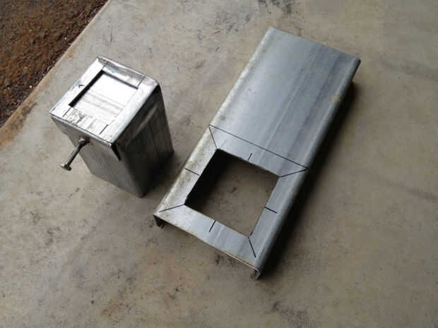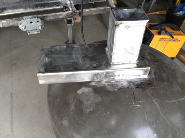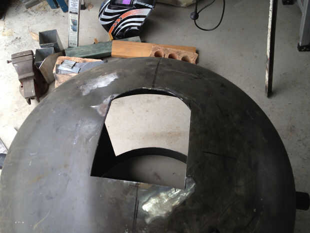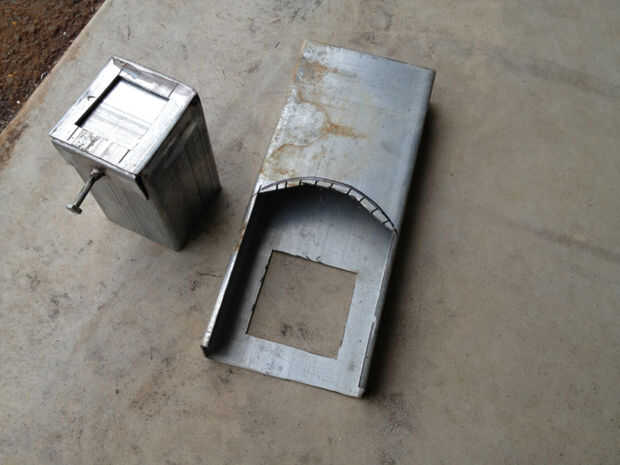 De todas formas lo que hice fue tomar un 15 x 5 cm cortada, que medía 30cm de longitud y corte un agujero cuadrado para mi colector de ceniza. Entonces corte un cuadrado de 15cm desde la parte inferior del tanque. Para tener este sit tubo al ras que necesitaba cortar un arco en la parte frontal del agujero. Este arco es horizontal a través de la curva de la cúpula del fondo. Tener acceso a un nivel láser habría hacer esto muy fácil. Ningún láser significa que simplemente lo dio mi mejor suposición. Resultó que no era perfecto pero razonablemente cerca. Una vez satisfecho con el corte en que coloca el tubo, utiliza dos imanes para mantener horizontal mientras que había marcado el arco en el tubo desde el interior. No corté este arco exactamente, quería conservar un pequeño borde que pude soldar a desde el interior del tanque.