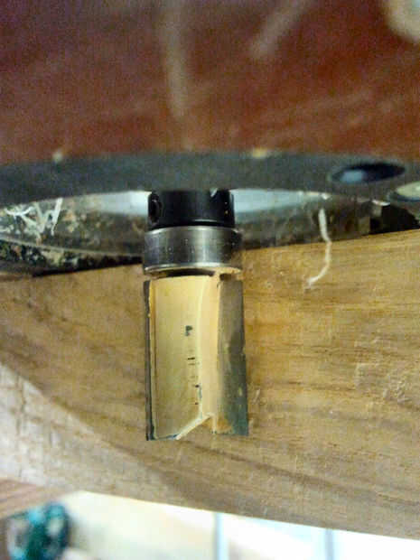 Tiempo para sacar el router y configurarlo con una descarga corta poco. Estoy usando una caña de 1/4" con 1/2" diámetro de rodamiento y cortador Queremos que la guía de tipo superior. La broca de fresadora replicará lo que el rodamiento de rodillos a través, así que antes de empezar, arena lejos de cualquier indeseado crestas de la sierra. Una lijadora de bobina es excelente para esto, pero no tenemos una, por lo cuidadoso de las manos de lijado está en orden - una herramienta giratoria dremel tipo puede también ser útil aquí. Basta cortar la parte superior del borde donde se ejecutará el cojinete de la guía - que es el bit que replicará el cortador.