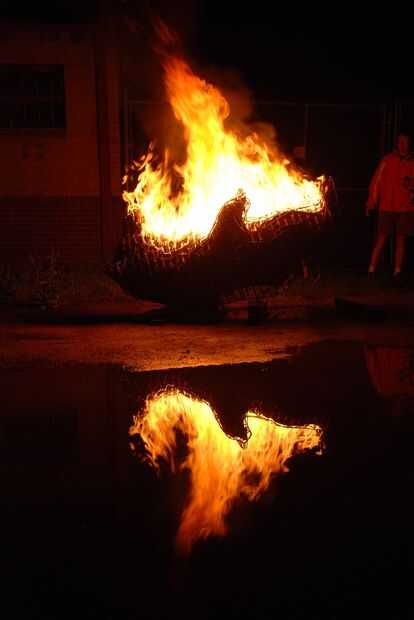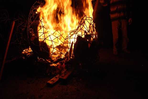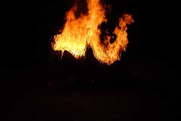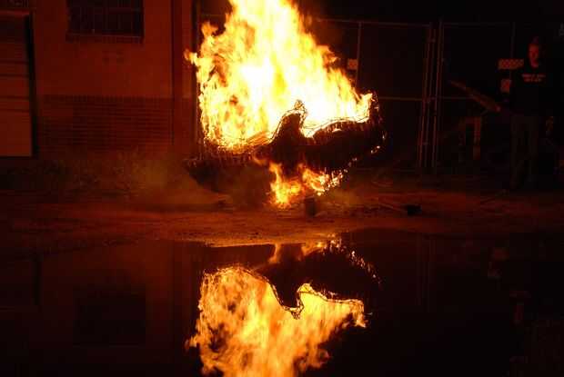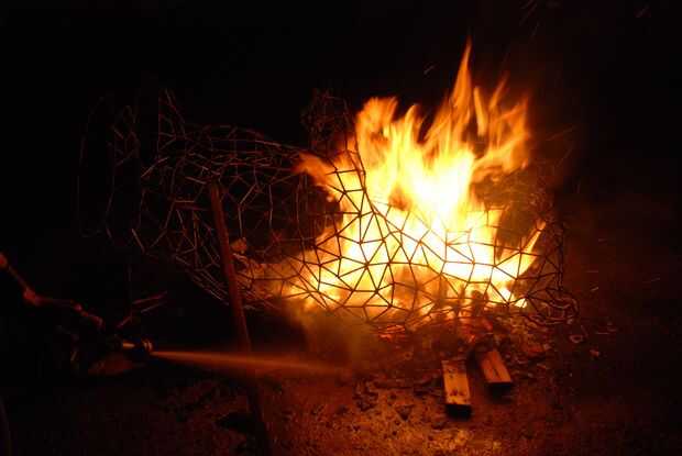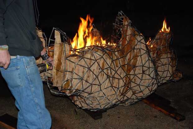 El fuego empieza a quemar la madera, el carbón y la ceniza comenzará a caerse de la parte inferior de la pieza. Utilice la manguera de agua y rocíe boquilla para rociar a estos carbones. Mantendrá la pieza se caliente en la parte inferior. No te preocupes de conseguir un poco de agua en el fuego, una vez que el fuego se va es un poco de trabajo para poner hacia fuera. Sólo asegúrese de que la pieza mantiene frío semi.