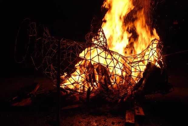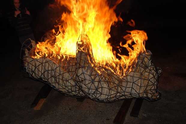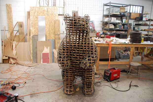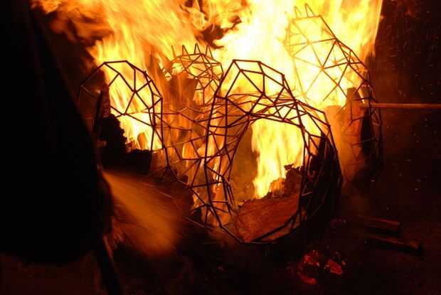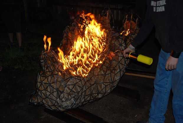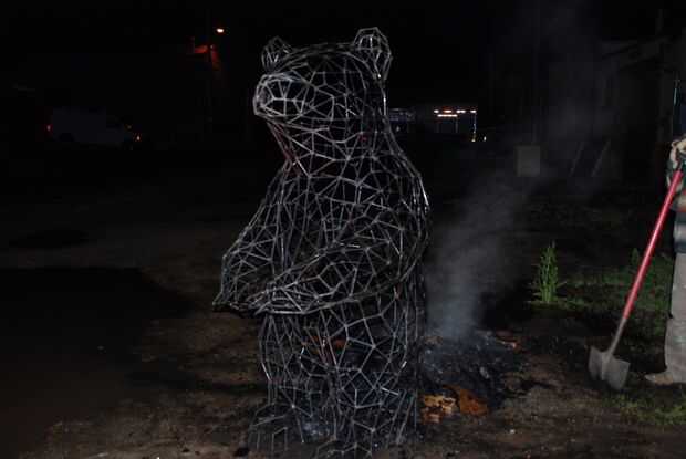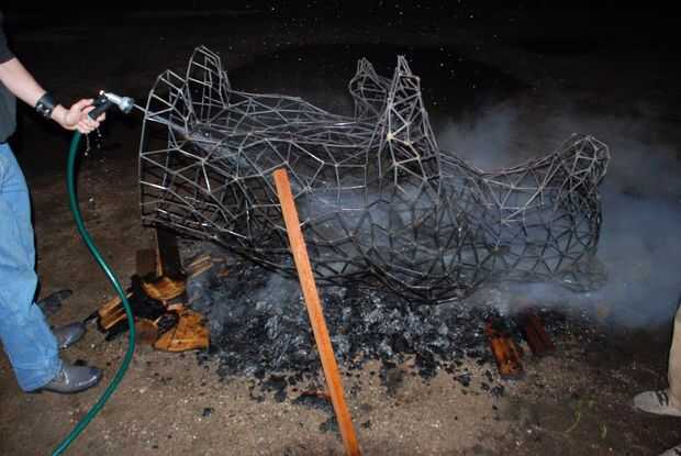 Una vez que los interiores han quemado bastante, es hora de apagar el fuego. Ya que tenemos abiertas patas en la parte inferior de nuestro oso nos podemos retirar algunos pedazos incombustos medianos decentes de madera de la parte inferior. Asegúrese de que usted remojar los trozos de carbón y la escultura de marco de alambre sí mismo con mucha agua. El acero es muy caliente y desea asegurarse de que cada punto solo se ha ido antes de agarrar la estructura.