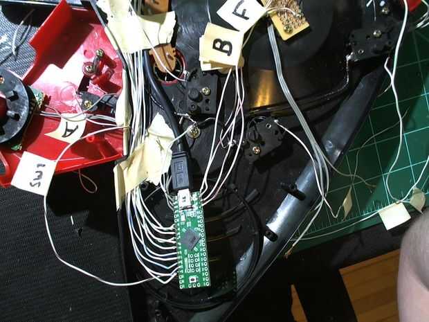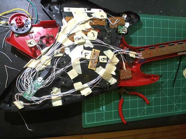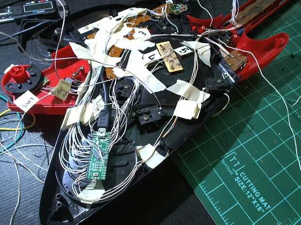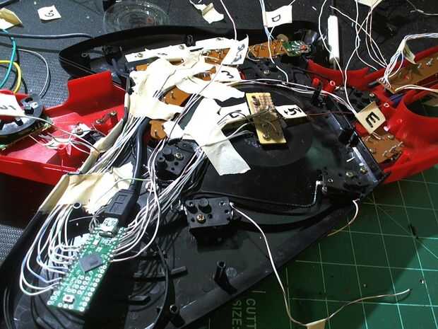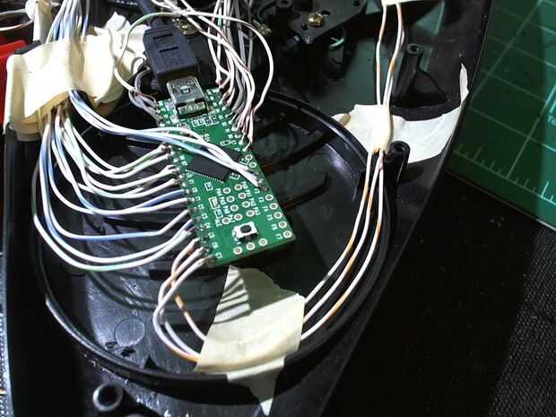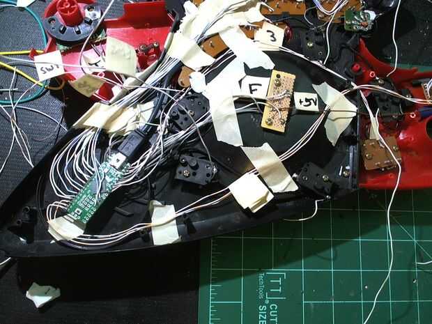 Recoger un cable o grupo de cables y encontrar una buena manera de distribuirlo que no va a hacer difícil cerrar el juguete detrás encima otra vez. Encontrar espacios vacíos que no tienen nada en ellos y tratar de evitar los mensajes que se utilizan para tornillos. Tus dos mejores amigos en este proceso será sticky tack y la cinta de enmascarar. Echa un vistazo a mis fotos del proceso para tener una idea de cómo iba exponiendo mis cables y soldar al microcontrolador.