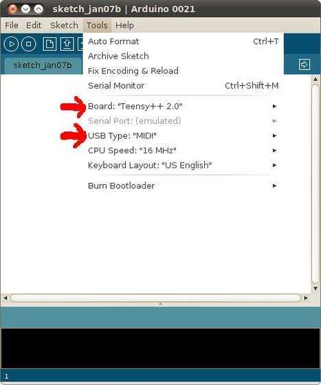 El Teensy es capaz de enviar que MIDI mensajes sólo cuando se configura un dispositivo de MIDI! Para ello, basta con ir a la Herramientas > USB tipo menú y seleccionar "MIDI". La desventaja de esto es que en el modo MIDI, usted no puede enviar o recibir mensajes de serie. Por esta razón hicimos la depuración en pasos anteriores - usted debe ya averiguado si todos sus pernos funcionan, simplemente estamos añadiendo al sistema de trabajo en este paso!