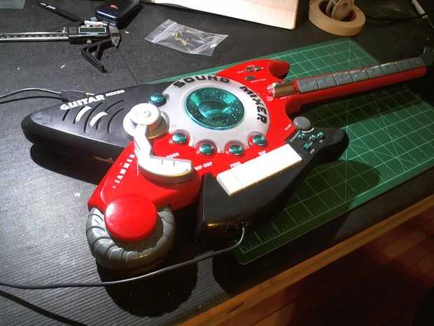 Topé con esta belleza un día en mi Ejército de salvación local y sabía que tenía que tenerlo tan pronto como lo encontré. De hecho, me decidí a hacer este artículo después de que me encontré con esta guitarra, porque pensé que sería un instrumento de MIDI tan cool! Las características de la guitarra una gran variedad de piezas que se pueden presionar, girar, sacudió e inclinado. Incluso incluye algunas luces limpias y características inusuales (como ese gris de la rueda en la parte inferior – gira!). Cuando llevé casa, rápidamente descubrí por qué fue desechado; había una grieta en el plástico de los trastes, hacer todo flex de maneras impares. Además, las baterías estaban muertas. Me aplicado pegamento súper grietas y quitado las baterías, y la guitarra era buena como nuevo!