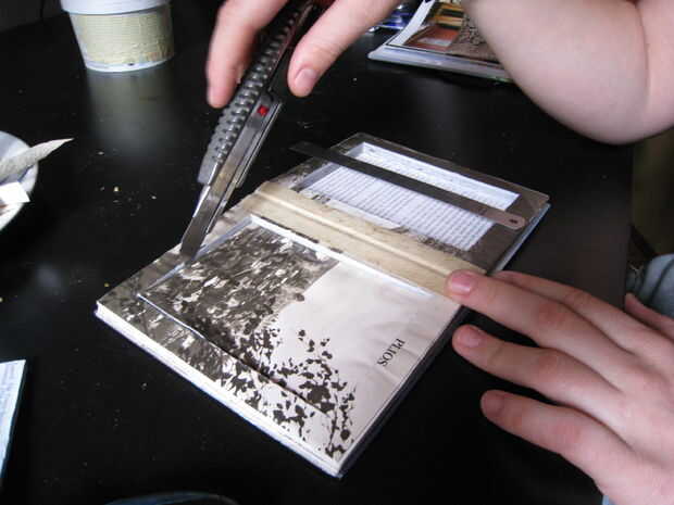 -Recortar. Doblar las outcovers (aquí nos olvidamos de hacerlo en la foto) para no dañarlos. Después de haber acabado de cortar el interior cuadrado te va va a pegar en las outcovers.