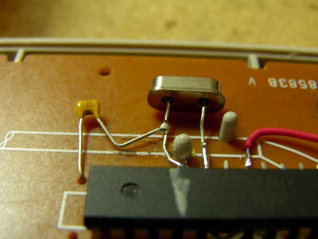 El primer capacitor es palo bonito, fácil, un orificio sobra ic (almohadilla # 8) y soldadura de la pcb, el otro cable al conductor más cercano del cristal de la soldadura