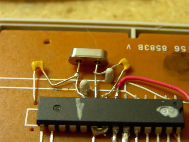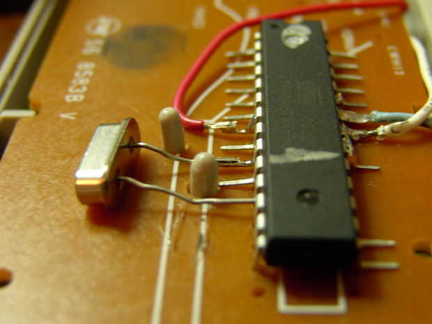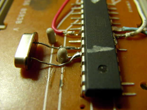 El otro condensador está un poco más de un dolor en el trasero, debido a un segundo poste plástico, usted puede cortar este post también si lo desea, pero he trabajado alrededor de ella, un cable de ese condensador debe soldarse con el segundo cable del cristal, y el segundo cable del condensador debe ser soldado al pin #8 del atmega (se trata de un conector de tierra)