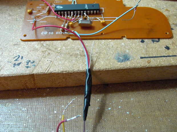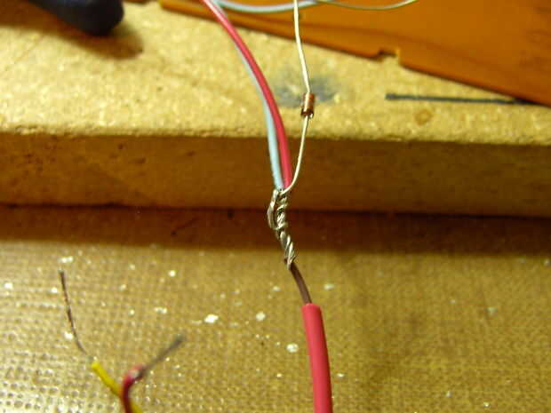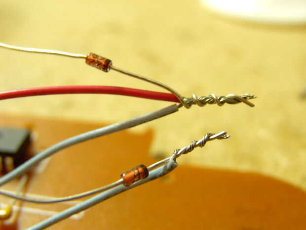 Debe tener los otros terminales de los diodos todavía sobresale, elegir cualquiera uno se ve más largo y la soldadura que el cable del condensador que está conectado a tierra (al otro lado se conectaría el cristal), a continuación, suelde el otro diodo conductor el primer diodo el conductor por lo que son ambos conectados a tierra