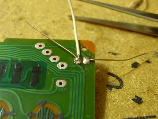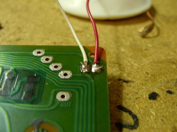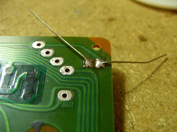Ahora soldar 2 cables de puente a los cojines (que podría haber hecho esto diferentemente pero retrospección es 20/20) para la tierra y + 5v, ahora usted puede cortar los cables del condensador