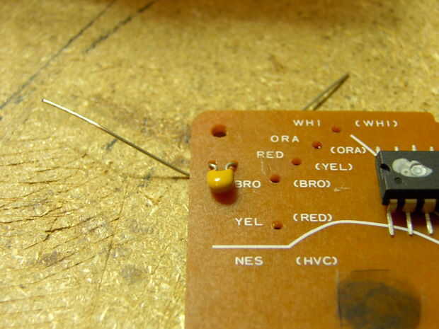 Inserte su 0.1uf tapa en la parte superior de la placa, doblez del excedente por lo que pone plano y lejos del orificio del tornillo en la esquina, voltee la Junta y sus cables a las pastillas, pero no ha acortar los cables cortos de soldadura