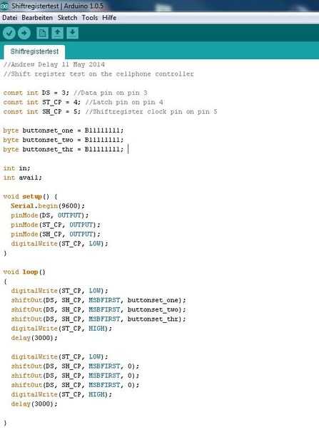 - 'buttonset_one', '... _two 'y'... distancia ' son los salidas de los registros de cambio se establecerá en los Estados. Cada registro de desplazamiento tiene 8 salidas, así que cada buttonset es un byte de largo. El 'B11111111' establecerá para todas las salidas a 5V.