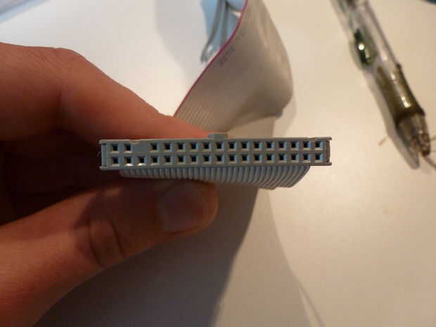 Si usted termina con una almohadilla que ha sido soldada a pero no se conecta con cualquier pin hembra en el cable de cinta, tiene el mismo problema que tuve. Contar el número de alambres en el cable de cinta. Contar el número de pines hembra. ¿Son estos dos números iguales? Mina no. Eso es porque hay un alambre en el cable de cinta que debe conectar al pin que es ahora de plástico sólido (véase la foto de la hembra).