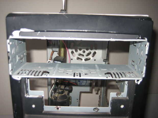 Una vez que lo tienes aclarado puede hacer un visual de donde se montan los diferentes componentes antes de empezar a cortar. El estéreo es más grande que el agujero para el CD-rom por lo que tendrá que cortar ambos lados.