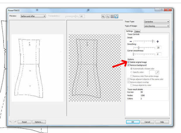 En el menú de mapa de bits, elija Línea central traza, luego elegir línea de dibujo del menú emergente. Se abrirá la ventana de PowerTRACE. Dar al programa un minuto para generar su rastro. Compruebe para asegurarse de que todo está bien y no se olviden de todo lo que necesite rastrear. Si es necesario, jugar con los controles para obtener un mejor resultado. Asegúrese de que la casilla "borrar la imagen original" es marcada, entonces golpeó "OK" para aceptar la traza.