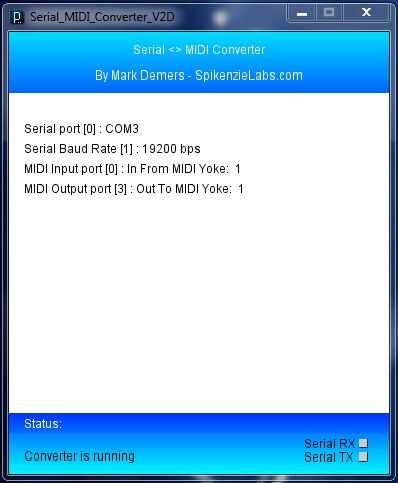 Este programa es para depuración solamente. Puede adjuntar MidiOX al puerto midi virtual y supervisar todos los datos que se envía desde el convertidor serie-Midi. Esto puede ser útil para determinar el desplazamiento y comprobar el código de arduino en caso de tener que cambiarlo.