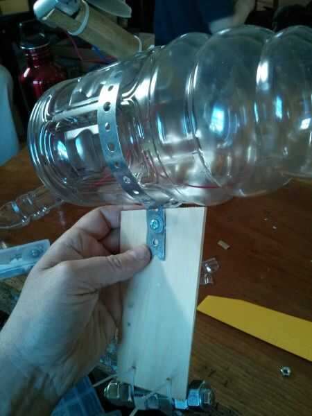 Para el cuerpo de la quilla, utilizar un un pedazo de cedro calzo ó nada de conveniente tamaño y grosor. Montarlo en la botella por un pedazo de tubo colgante correa envuelta alrededor de él. Doble la correa de 90 grados en el punto donde se encuentra con la quilla, pero hacerlo de tal manera que cuando pones un tornillo a través de la correa y la quilla y apretar, comprimir la correa y agarre la botella firmemente.