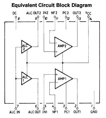 Los cables de cinta principal (que estoy usando como entrada desde el reproductor de MP3) se unen a la placa de circuito y rastros funcionaron a partir de ahí a un IC LA3220 chip (ver segunda foto). Miré este chip un sitio web de hojas de datos (ver tercera foto) y encontró que es un amplificador ecualizador que aparentemente actúa como un preamplificador para el cabezal de cinta.