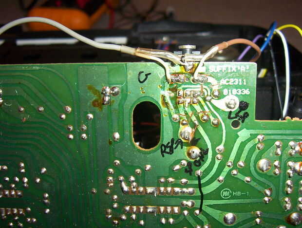 Para usar al gato, yo sabía que necesitaba para desconectar del resto del circuito de audio. Para desconectarlo con él en su lugar, realmente utilicé un destornillador pequeño para raspar a través de los rastros de circuito para que los auriculares ya no serían realmente conectados a nada. Consulte las notas en la imagen para otros detalles.