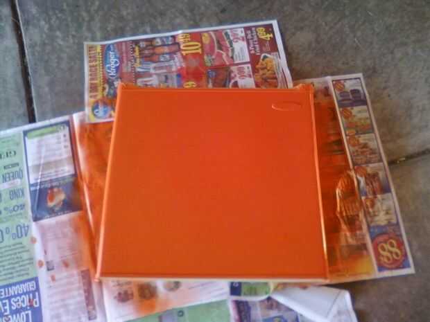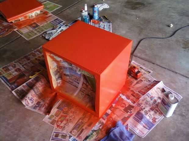 Con el color de la pintura de aerosol de su spray de elección la puerta y fuera de la nevera. Hice varias capas de cada uno para darle un mejor color.