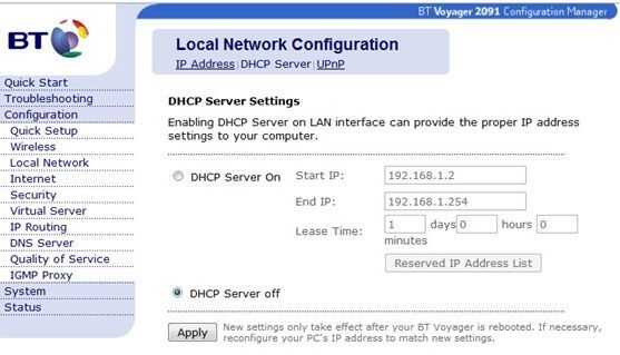 Introduzca los ajustes de configuración y seleccione Configuración de red Local. Una vez en este menú en una de las pestañas superiores se dice servidor de DHCP es la configuración que desea cambiar seleccionando esta pestaña y apagar el servicio.