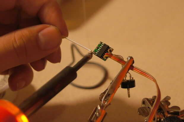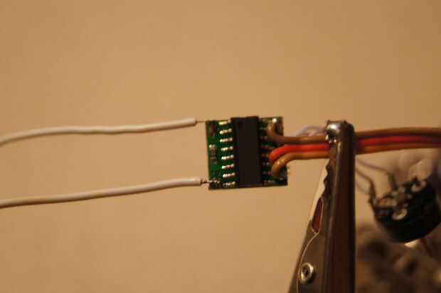 decidí poner diseño conduce en para lo que puedo experimentar, sin embargo puede poner en los cables directamente a los LEDs si usted sabe su composición exacta antes de tiempo. Corté el cable de conexión protoboard en medio por lo que estaba matando sólo 1 plomo. Entonces yo había soldado cada mitad en donde fueron los conductores del motor. Esto permitirá prototipos y fácil interfaz. El siguiente diagrama muestra cómo funciona el circuito, observe la posición de la esfera en el probador servo rojo. Cuando centrado (si el potenciómetro se centra) ni luz deberá encenderse. Cuando una forma, un color debe encender, cuando lo contrario se enciende el otro color.
