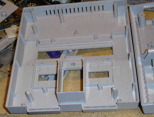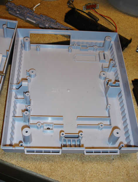 2) una vez abierto el Super NES, desatornille y retire todas las "tripas". Lo único que se mantendrá es el caso, el poder y los interruptores de reset, la placa del puerto trasero y la placa de puerto de controlador frontal.