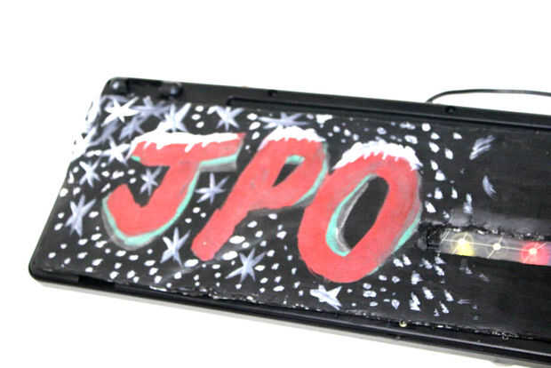 Permite ser creativo y pintura nuestra placa! Para mi arte, pinté el nombre de mi banda "JPO" y he añadido los copos de nieve ya que estábamos jugando un espectáculo de invierno. Me encantaría ver qué tipo de obra de arte la gente llegar a, por favor, comparta los resultados en los comentarios de este instructable.