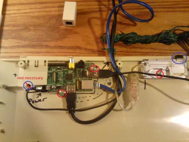 Hub USB añadido. Círculos rojos muestran en retención de tornillos se colocan. Los tornillos y las arandelas que sostienen el IPC en lugar ahora también contienen los topes de goma. Un ícono mantiene los cables. Mantengo mi twisties juntos girándolas simplemente libremente juntos para la accesibilidad y fácil almacenamiento. También se muestra aquí es el acoplador de Cat 5 que conseguí en eBay por $.50 centavos (dos por un dólar con el envío libre). Necesitaba usar este portátil para mi proyecto terminado. Sí, mi próxima compra será un dongle Wi-Fi para poder acabar con el cable Ethernet. Pensé que tenía una de repuesto, como se muestra aquí insertado en el centro, un círculo azul. El agujero que perforó en el hub USB estaba en la zona de sangría donde al final se remete en cuando no esté en uso. Nada dentro de la caja allí. Ya había perforado un agujero para el cable de alimentación antes de cambiar mi mente y bucle todos los cables juntos.