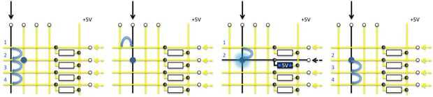 En las anteriores cuatro rejillas, se presiona el botón conexión de la segunda columna a la segunda fila. Para comenzar con todo en alto. La primera columna se cambia a bajo, y el controlador comprueba la tensión en cada fila para ver si hay una caída (primer grid). Se presiona ningún botón en la columna para todas las filas en 5V. La primera columna devuelve alta, y la segunda columna se envía baja (segunda imagen). Las filas secuencialmente se comprueban otra vez. El botón presionado en la segunda fila se conecta la fuente de 5V de la segunda fila a los 0V de la segunda columna por medio de la resistencia + (tercera imagen). El regulador detecta el 0V en esa fila y sabe que el segundo botón de la segunda columna es que la letra 'j' tan salidas de la tecla 'j'. El ciclo continúa a lo largo de las columnas y las filas, a continuación repite (Cuarta imagen).