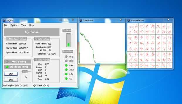 Ahora espere un momento. Echa un vistazo en la ventana principal de J-QAM. La frecuencia portadora fluctuará como el receptor obtiene un bloqueo. Cuanto más cerca estás para un bloqueo acertado menos saltan los números de alrededor y más estable se convierte y luego le muestra la frecuencia portadora apropiada en nuestro caso busque 7250 o un número que se obtiene más y más a aquél. Puede que necesite ajustar cuidadosamente la línea de entrada para J-QAM obtener un bloqueo de volumen. Empiece en el 1% y con el teclado. Golpeó entonces la llave de flecha para subir el volumen el 1 por ciento. Espere unos segundos mientras la ventana principal de J-QAM como hacerlo hasta llegar a un bloqueo. Medida que se acerca al volumen apropiado comenzará a aparecer la frecuencia 7250 detectada en portador frecuencia Visualiza en la ventana principal J-QAM. Dentro de unos instantes se obtendrá un bloqueo exitoso, y ahí lo tienen.