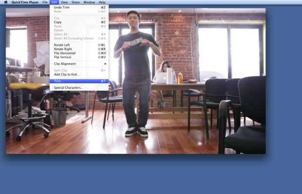 Una manera fácil para acortar videos en Quicktime es utilizar el comando Trim. (Comando + T o Edición > cortar)