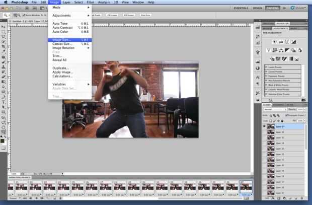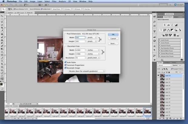 Para optimizar mi animación para la web es una buena idea para reducir la calidad de imagen. Empecé jugando con la configuración de tamaño de imagen (opción + comando +I o imagen > tamaño de imagen)
