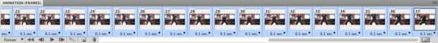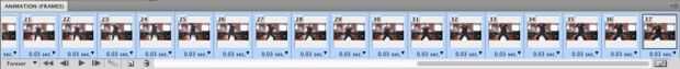 La cantidad predeterminada de tiempo para cada fotograma Mostrar es de.03 segundos, pero quería hacer este gif comedically más rápido. En la barra de animación, seleccioné todos los marcos. (Si no ves la barra de animación ir a ventana > animación para alternar en)