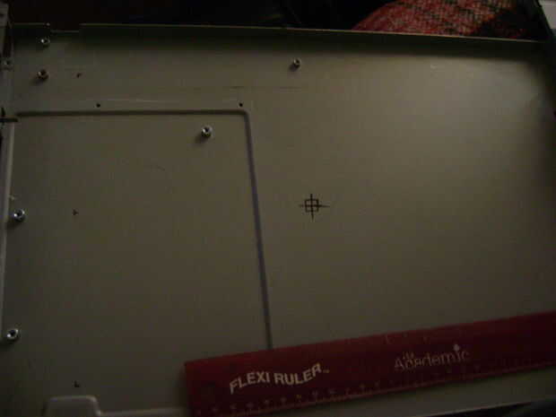 Antes de entrar en el meollo de intentar sellen la cámara en lugares al azar, mida su escáner y haga algunas notas basadas en el tamaño de la caja y el tamaño del vidrio (el mío es 8 3/4 "x 12 3/4". He medido la anchura de los bordes en la parte superior de la impresora y les marcó en el interior de la parte inferior, por lo que he podido encontrar el centro del vidrio en la parte inferior. He marcado con un objetivo para que se sepa exactamente donde debo poner la cámara.