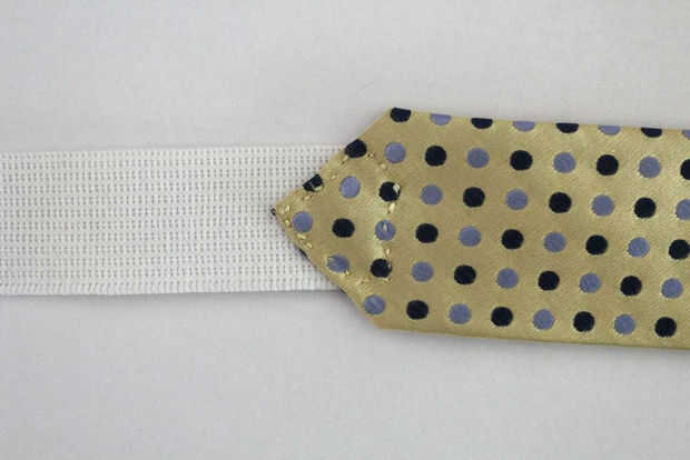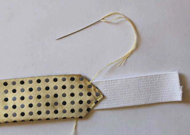 No vas a tener que cortar o medir cualquier cosa en este paso, así que no te preocupes todavía. Para empezar, prender al final de su elástica en el extremo estrecho de la corbata. Enhebrar la aguja y empezar a coser a mano a lo largo de los bordes del elástico, coser el elástico para el empate.